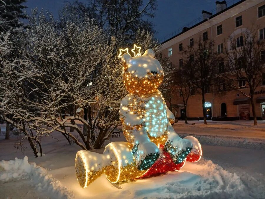 Фигурку мишки, сидящего на большой конфете, смонтировали на Театральной площади со стороны улицы Кирова. Ранее там же, но чуть ближе к ёлке, поставили светящихся снегирей. Напомним, на площади перед театром пройдёт праздник вечером 31 декабря. Полную афишу можно посмотреть здесь.