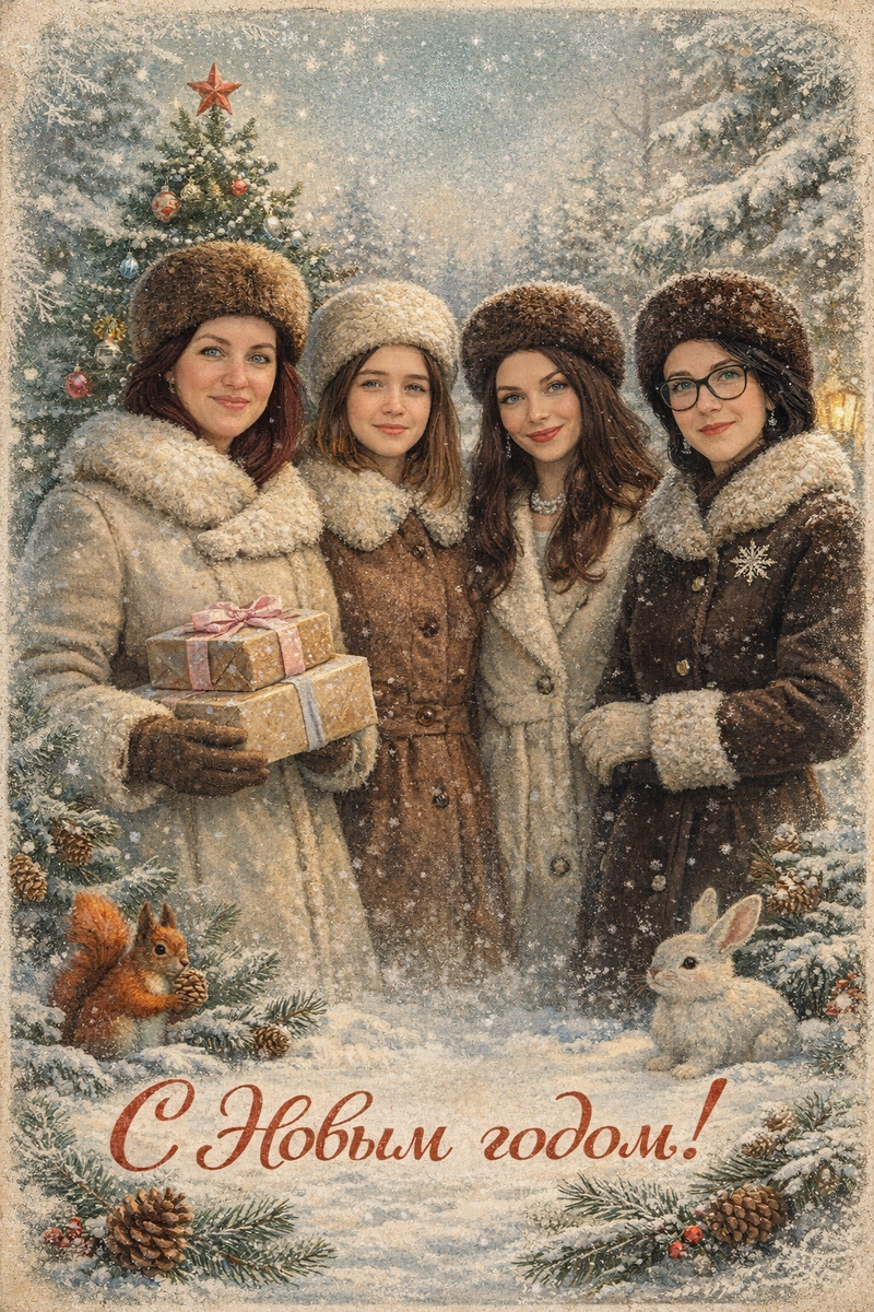 И пишем промт: Создай винтажную новогоднюю открытку с людьми с загруженной фотографии. Вертикальный формат 9:16. Стиль - советские открытки 1950-1970-х годов, мягкая живописная иллюстрация, ощущение тепла и уюта. Персонажи остаются в центре композиции. Фон - зимняя сказочная атмосфера. Лица: Лица сохранить максимально похожими на оригинальную фотографию Без изменения черт лица, возраста и ЭМОЦИЙ. Одежда и образы: Заменить современную одежду на старинную зимнюю советскую одежду (описываем во что одеты люди) У первой женщины — меховая советская шапка из ондатры, зимнее пальто/дублёнка Декор и детали: Новогодняя ёлка с простыми советскими игрушками Еловые шишки, хвойные ветки Лесные зверюшки (белочка, зайчик) в сказочном стиле Лёгкий снег, морозные узоры Цвет и атмосфера: Светлая, зимняя, мягкая цветовая палитра Пастельные оттенки, эффект старой бумаги, лёгкое зерно Сказочное, теплое новогоднее настроение Надпись: Текст: «С Новым годом!» Шрифт