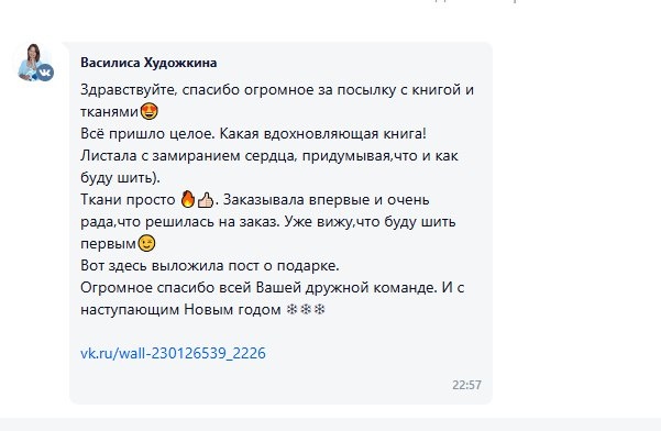 И каждый раз радуюсь, когда наши пошивы вдохновляют на творчество! Ольга, участница Донатов, выиграла книгу в розыгрыше и поделилась своими впечатлениями. Её слова для меня про доверие, про вдохновение и про то, что всё это действительно живёт дальше в ваших мастерских. Спасибо, что замечаете, пишете и делитесь. Такие отклики очень поддерживают и греют. 🤍