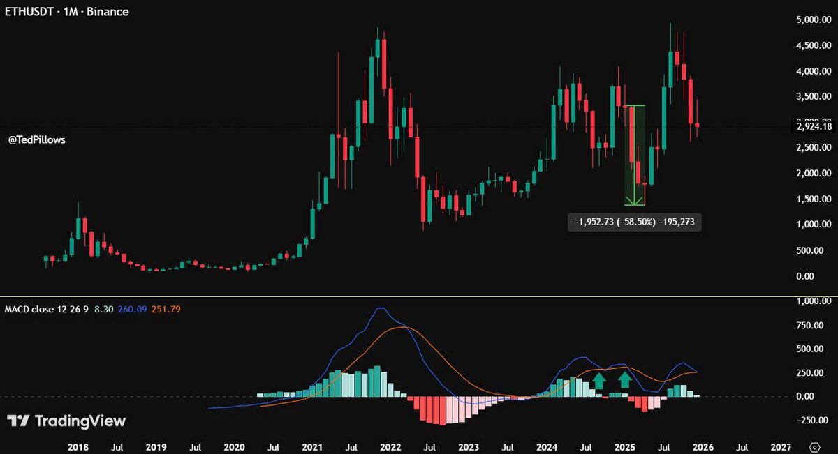 … Смотрю на месячный MACD по ETH — и ловлю себя на странном ощущении дежавю. Сигнал почти сформирован. Медвежий кросс. Тот самый, от которого рынок обычно вздрагивает. Факт простой: в прошлый раз, когда на месячном таймфрейме по Ethereum произошёл такой кросс, цена за несколько месяцев сложилась почти на 60%. Это был не шум, не «на минутках», а полноценный цикл охлаждения. Но есть нюанс, который рынок почему-то любит игнорировать. В Q3 2024 был точно такой же сетап. Тот же месячный MACD. То же напряжение. И… фейкаут. Цена не ушла в затяжное падение, а рынок просто вытряхнул нервы, прежде чем продолжить движение. Психологическая мясорубка в чистом виде. И вот здесь начинается самое интересное. MACD — это не кнопка «продать». Это индикатор фазы, а не направления. Он отлично показывает, что импульс выдыхается, но не говорит, будет ли это: — резкий слив — глубокая, но контролируемая коррекция — или затяжной боковик, который вымотает сильнее любого падения Месячный таймфрейм — это в