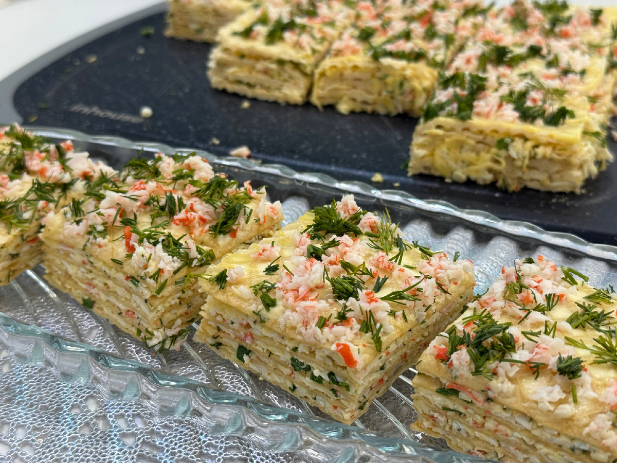- Украшаем тертыми крабовыми палочками и укропом.
