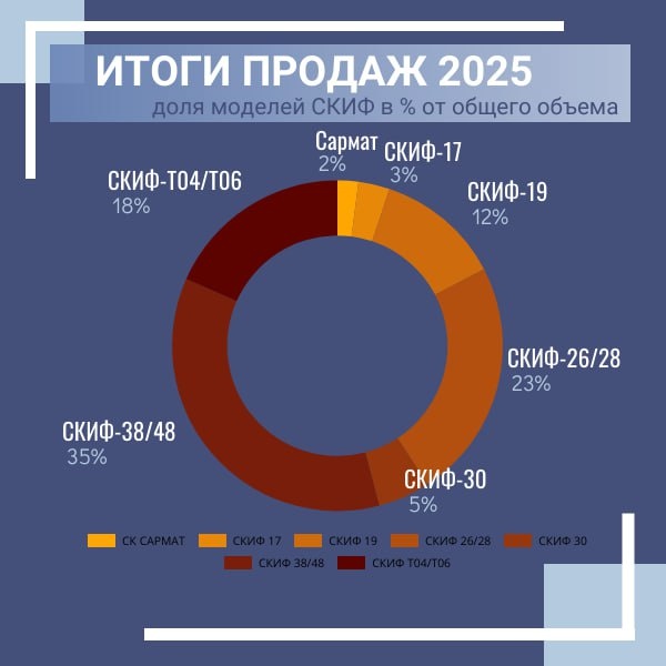 ✨ • Абсолютным флагманом в линейке 2025 года стали новые модели СКИФ-38/48 с долей более 35% от общего объема. • Вторая по популярности — СКИФ-26/28 (23%). • Третье место занимает СКИФ Т04/Т06 для пропашных сеялок (18%). Тенденция снижения. Самые продаваемые модели предыдущих лет — СКИФ-19, СКИФ-26 и СКИФ-28 потихоньку отходят на задний план. Рост новинок. Успешно пройдя испытания в разных климатических зонах в 2024 году, СКИФ-38, СКИФ-48 и СКИФ-48 EDX стали лидерами продаж 2025 года. Это указывает на смену поколений внутри линейки. Клиенты переходят с простых моделей на новые, более сложные с бОльшим количеством возможностей: управлением моторами, закладкой техколеи, мониторингом качества сева и пр. В целом год получился удачным. Импортозамещение пошло нам на пользу, мы справились💪. Чего и Вам желаем в Новом году!!!🎄