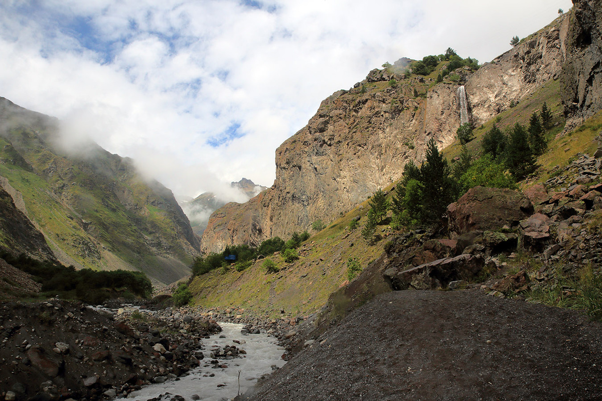 В последний день нашего пребывания в Терсколе был отдан прогулке к водопаду Азау. Собственно эту прогулку можно было совместить с прогулкой на Приют 11 (https://dzen.ru/a/aU1R0Oi0YXgRSAvr), так как водопад находится вблизи канатной станции на Азау. Но хорошая мыслЯ приходит, как известно, несколько позже... С другой стороны следующий день не пропал зря. Хотя, в Баксанском ущелье можно было найти и иные развлечения. Все опять началось с экологической тропы и реки Баксан. Река Баксан Вид на водопад открывается при входе в ущелье выше поворота к станциям канатной дороги. Водопад красив, но к нему лучше выбираться ближе к обеду. Он в это время становится более полноводным. Погода в этот день была не очень приветливой. Сверху сыпал мелкий дождь. Но падать водопаду это "не мешало". Правда, приходилось беречь объектив не только от водных брызг водопада, но и от дождя. Непосредственно к водопаду ведет довольно крутая и не очень приятная тропа. Поэтому Надя предпочла любоваться водопадом изд