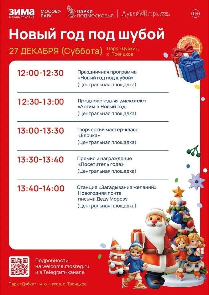 ✨ Фестиваль НОВЫЙ ГОД ПОД ШУБОЙ в парке Дубки 👉12:00 - 12:30 Праздничная программа «Новый год под шубой» 👉12:30 - 13:00 Предновогодняя дискотека «Летим в Новый год» 👉13:00 - 13:30 Творческий мастер-класс «Ёлочка» 👉13:40 - 14:00 Станция «Загадывания желаний». Новогодняя почта, письма Деду Морозу 🚫 Возраст: 0+ 📆 27.12.2025 🏢 Парк культуры и отдыха «Дубки» 📍 г.о.Чехов, с.Троицкое, парк "Дубки" 🪙 Вход свободный❗️ ⭐Поддержать канал голосом ✅ Мероприятия Чехов https://dzen.ru/id/66cc4b48e9ef144699238a51 http://vk.com/chekhov_events http://dzen.ru/chekhov_events