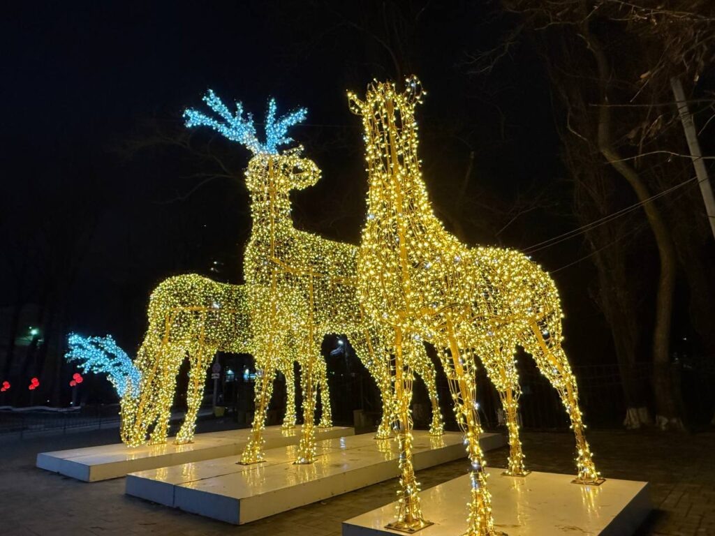 В преддверии нового года на улицах города Аксая появляется множество разноцветных огней, новогодних фигур и композиций