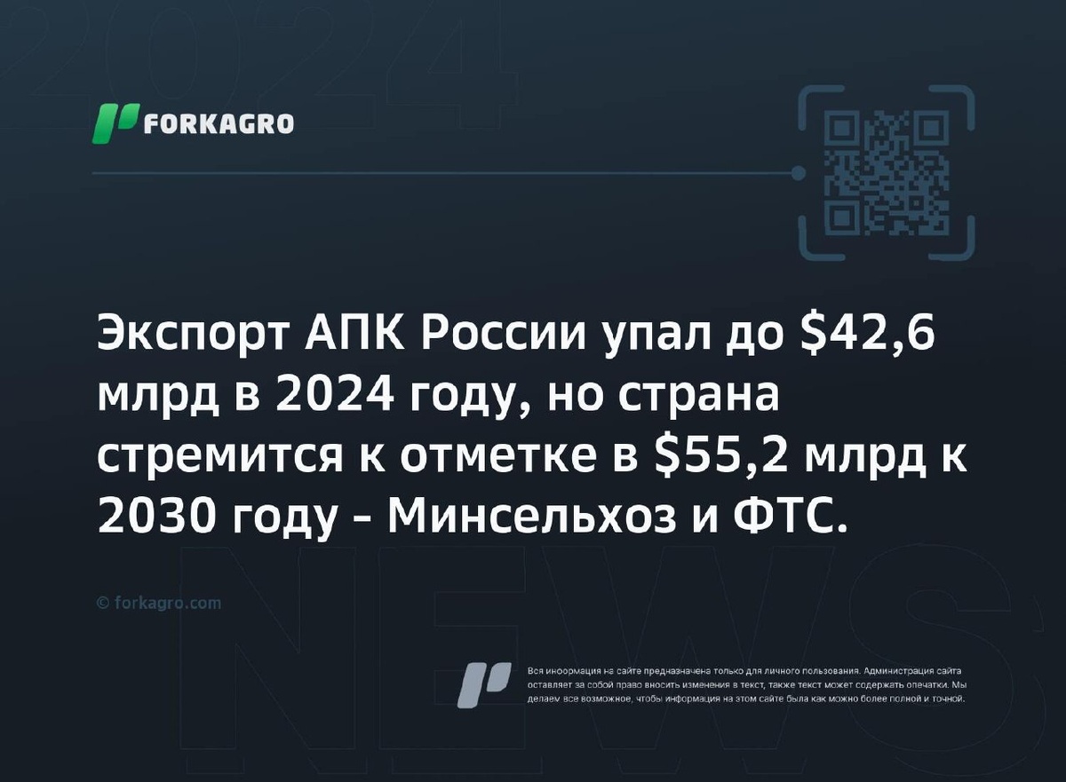 Экспорт АПК России упал до $42,6 млрд в 2024 году, но страна стремится к отметке в $55,2 млрд к 2030 году - Минсельхоз и ФТС