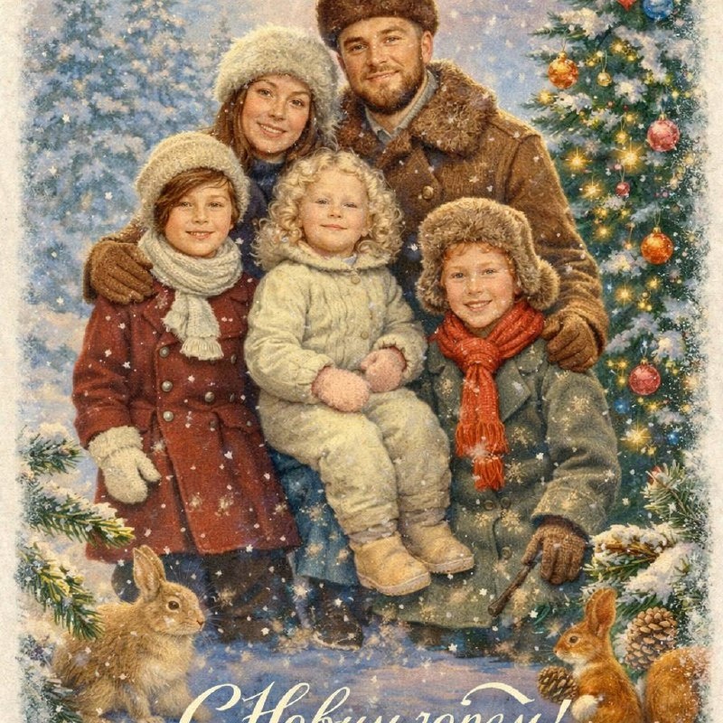 🗄Как создать свой винтажный шедевр: 1. Зайди в бота → @GPT4Telegrambot 2. В меню выбери «Создать картинку» → GPT Images (доступен бесплатно). 3. Прикрепи свои фотографии (для GPT Images нужна общая фотография, модель принимает только одно вложение) 4. Скопируй и вставь промпт Фото с котиками и Праздничная иллюстрация в стиле старых советских открыток середины XX века, выполненная гуашью. Композиция: женщина в меховой шапке держит (кота), рядом мужчина в зимнем пальто с (котом). Критически важно: лица персонажей и животных точно воспроизводят черты, пропорции и выражения с приложенных фотографий, адаптированные под живописный стиль. Окружение: заснеженный городской пейзаж, украшенные ёлки, крупные снежинки. Колористика винтажная – приглушённая палитра с голубовато-белыми и тёплыми красно-коричневыми акцентами, эффект выцветшей полиграфии. Текстура бумаги шероховатая с зернистостью, контуры мягкие. Надпись декоративным каллиграфическим шрифтом: «С Новым 2026 Годом!» Общее настроение –