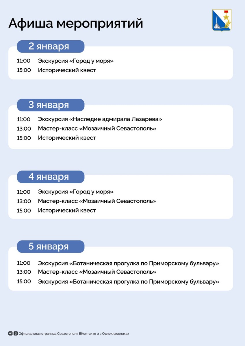! Π‘Π΅Π²Π°ΡΡΠΎΠΏΠΎΠ»ΡΡΠ΅Π² ΠΈ Π³ΠΎΡΡΠ΅ΠΉ Π³ΠΎΡΠΎΠ΄Π° ΠΏΡΠΈΠ³Π»Π°ΡΠ°ΡΡ ΠΏΡΠΎΠ²Π΅ΡΡΠΈ ΠΏΡΠ°Π·Π΄Π½ΠΈΡΠ½ΡΠ΅ Π΄Π½ΠΈ Ρ ΠΏΠΎΠ»ΡΠ·ΠΎΠΉ ΠΈ Π²ΠΏΠ΅ΡΠ°ΡΠ»Π΅Π½ΠΈΡΠΌΠΈ. Π Π½ΠΎΠ²ΠΎΠ³ΠΎΠ΄Π½ΠΈΠ΅ ΠΊΠ°Π½ΠΈΠΊΡΠ»Ρ ΠΏΡΠΎΠ΄ΠΎΠ»ΠΆΠ°ΡΡ ΡΠ°Π±ΠΎΡΠ°ΡΡ ΡΡΡΠΈΡΡΡΠΊΠΎ-ΠΈΠ½ΡΠΎΡΠΌΠ°ΡΠΈΠΎΠ½Π½ΡΠ΅ ΡΠ΅Π½ΡΡΡ β ΡΠ°ΠΌ ΠΏΠΎΠ΄ΡΠΊΠ°ΠΆΡΡ, ΡΡΠΎ ΠΏΠΎΡΠΌΠΎΡΡΠ΅ΡΡ, ΠΊΡΠ΄Π° ΡΡ