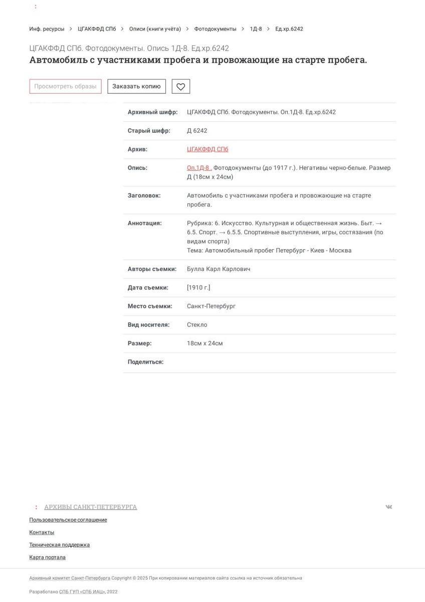 ». Дата выпуска: 1910 г. (по данным: «[1910 г.]»). Тип издания: фото. Формат: 18см х 24см. Носитель: Стекло, черно-белый негатив. Изображение: Фотография запечатлела момент старта автомобильного пробега Санкт-Петербург - Киев. Художник: Булла Карл Карлович. Музейный (каталог) номер: ЦГАКФФД СПб. Фотодокументы. Оп.1Д-8. Ед.хр.6242. Теги: #автомобиль, #пробег, #СПб, #1910г, #Булла, #фотография, #Автомобильная, #спортивное_событие.