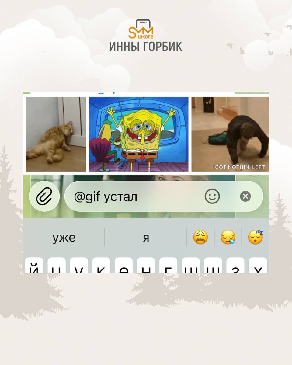 🌟1. Бот по поиску гифок стоит только написать в любом чате так: @gif и любое слово описывающее ваше состояние или настроение которым хотите поделиться и бот находит подходящие гиф. 🌟2. Бот по самостоятельному и быстрому изготовлению мемов @memer Для поиска картинок используем смайлики, а текстом пишем что хотим разместить на картинке. Пользуйтесь и отправляйте друзьям 🌟