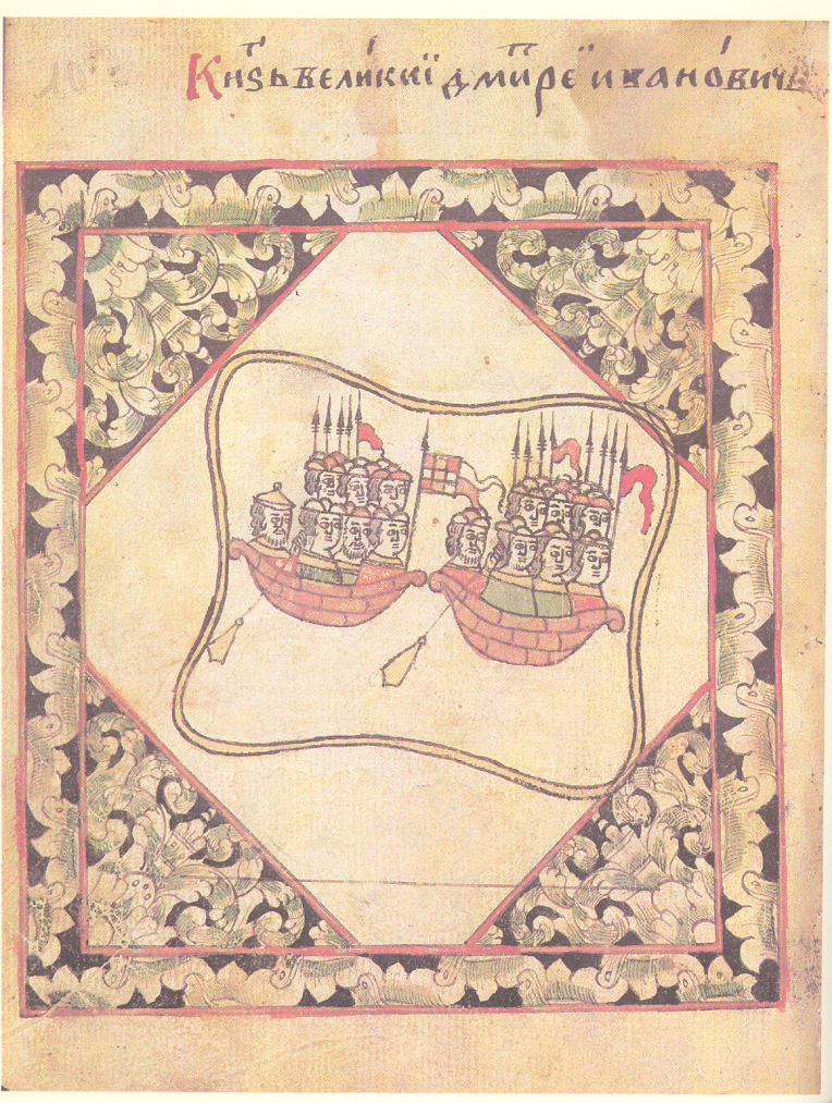 То, что двойственность играла в древности основополагающую роль в жизни Руси, можно показать на примере портрета Дмитрия Донского. Каждый правитель должен был соединиться с Двоей, чтобы успешно управлять страной. Это же касалось военоначальников и высшего духовенства. Простые люди тоже тянулись за ними. Потому что только Двоя помогает достигать надёжных результатов. Троя без Двои не работает. Это портрет князя Дмитрия Донского. Как видите, лицо не имеет значения, важно внутреннее наполнение князя. Перед нами два квадрата повернутые на 45 градусов друг относительно друга, как на иконе Спас в Силах. Значит, князь владел Силами. Полное толкование иконы см. в книге «Дорога Домой». Внутри квадрата (олицетворяет, скорее всего, четыре стороны света) нарисованы два корабля – перед нами целостная двойственность, то есть единство двух начал, мужского и женского. На это же единство начал указывает бело-красный стяг, прикреплённый к флагу с крестом. Белое и красное это знак единства мужчины и же