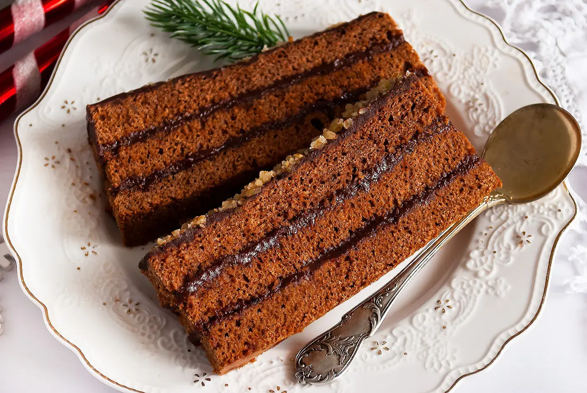 Для зимних холодных вечеров с большим пузатым чайником ароматного чая лучше выпечки и не придумать как этот мягчайший пряно-медовый пряник с нежным сливочно-шоколадным пралине. 500 г муки 3 столовые ложки какао 200 г жидкого меда 25 г пряностей для имбирных пряников 1 чайная ложка корицы 1 чайная ложка растворимого или зернового кофе (по желанию) 140 г сливочного масла 4 яйца комнатной температуры 3/4 стакана сахара 1 и 1/2 чайные ложки пищевой соды 150 мл 18% сметаны комнатной температуры 120 мл 30% сливок для взбивания 100 г молочного, темного или горького шоколада 550 г сливового джема 100 г темного шоколада Молотые грецкие орехи для украшения. *Объем одного стакана составляет 250 мл. Выстелите форму для выпечки размером примерно 26 x 36 см или подходящую вам форму пергаментной бумагой. Просейте муку и какао в миску. Влейте мед, пряности, молотый кофе и кусочки сливочного масла в кастрюлю или миску. Нагревайте на медленном огне или в микроволновой печи, пока ингредиенты не растают.