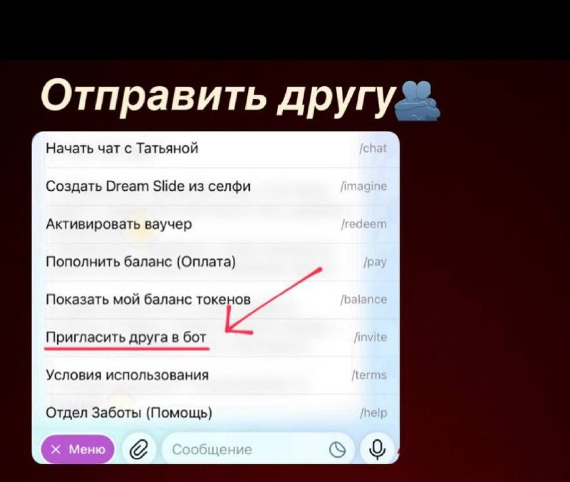 ? -Конечно, мы приветствуем! Пока действует акция, вы можете отправить ссылку на Tatiana Secret своим друзьям, подругам, мужчинам. Они тоже получат 3 вопроса в подарок 🎁 Заходите в Меню👉нажимаете «Пригласить друга»👉Копируете ссылку и отравляете друзьям!