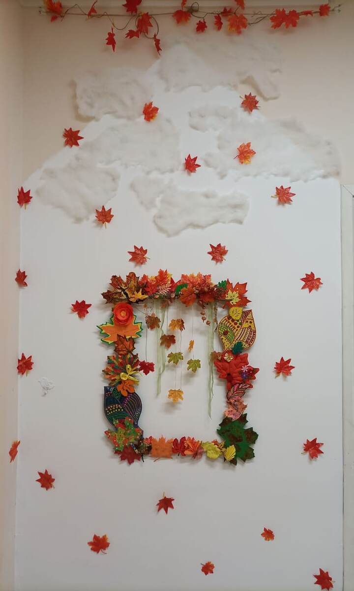 Осеннюю поделку сделали. В этом году было проще, нужно было всем сделать листик в любой понравившейся технике. И потом воспитатели сделали общую композицию.
