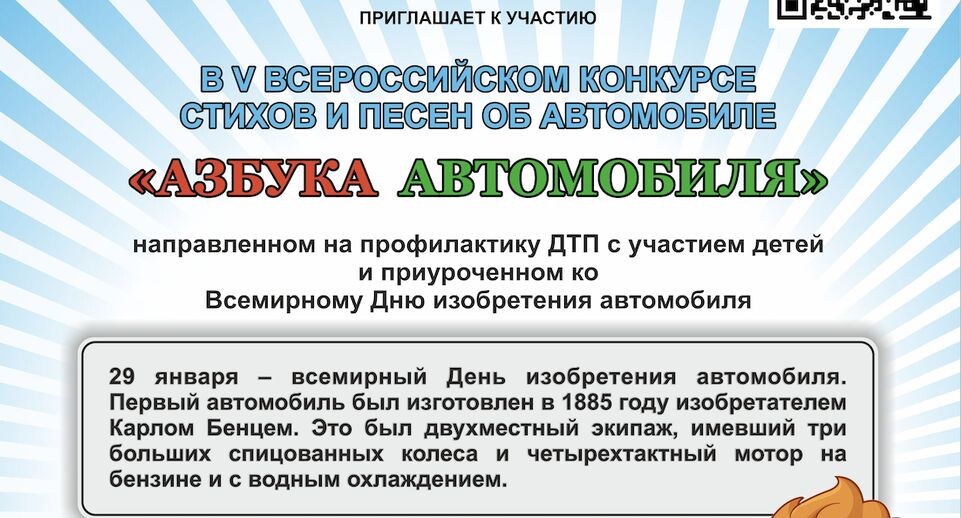 Благотворительный фонд поддержки детей, пострадавших в ДТП имени Наташи Едыкиной, объявил о старте V Всероссийского конкурса стихов и песен о безопасности дорожного движения «Азбука автомобиля», приуроченного ко Всемирному дню изобретения автомобиля, сообщает пресс-служба организаторов. Конкурс «Азбука автомобиля» направлен на профилактику дорожно-транспортных происшествий с участием детей. Организаторы приглашают к участию мальчиков и девочек в возрасте от 5 до 18 лет. Конкурс проводится с целью формирования у детей навыков безопасного поведения на дорогах через творческое развитие и художественное чтение стихов по правилам дорожного движения. Среди задач конкурса — повышение интереса к безопасности жизнедеятельности, вовлечение родителей и педагогов в вопросы дорожной культуры, а также развитие творческих и артистических способностей детей. Особое внимание уделяется формированию фонда стихотворных материалов, пропагандирующих правила дорожного движения. Работы принимаются на электрон