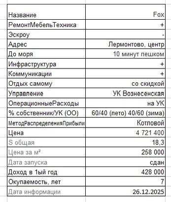 ! Сегодня с радостью представляю самый бюджетный лот — в Туапсинском районе, село Лермонтово. Вход от 4 721 400 руб. Прогнозируемая доходность: - В первый год — от 35 000 руб. в месяц. - Во второй год — от 50 000 руб. в месяц. И дальше — только рост! Плюс особый бонус: проект уже сдан и работает, так что доход вы начнёте получать сразу после сделки. Это реальная возможность для стабильного будущего, будьте богаты 💰💕 По вопросам приобретения, записи на видеопрезентацию и получения инвестиционного расчета пишите в личку или на Max 89965330899, Наталья 🌴