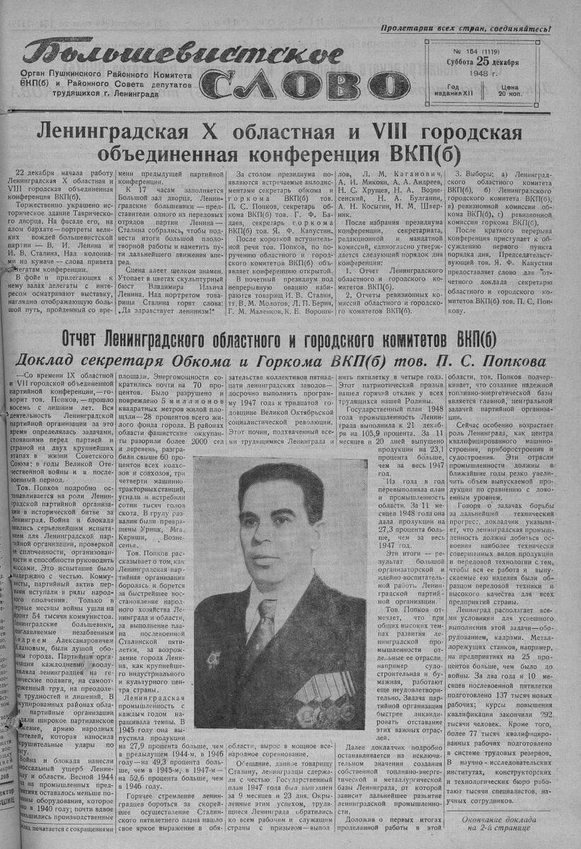 1948 газета - Большевистское слово, Пушкинский район г. Ленинграда. № 154 (1119) 25 декабря (суббота). #ЦС