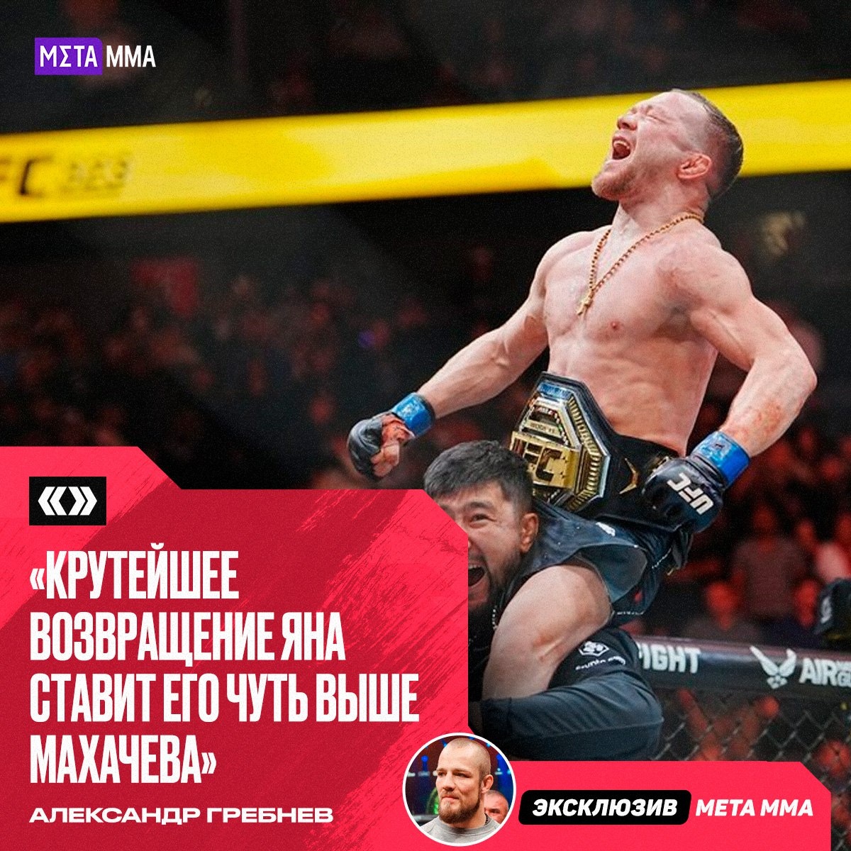 Российский полусредневес Александр Гребнев назвал Петра Яна лучшим бойцом России по итогам 2025 года — пусть и с минимальным перевесом. «Давайте скажем, что Петр Ян лучше на один процент. Махачев всегда был на пике в UFC, а у Пети был определенный провал по оппозиции, уровню и психологии. И крутейшее возвращение чуть-чуть выше его поднимает над Исламом. Это ближе к фантастике по сравнению со стабильной доминацией Махачева», – сказал Гребнев в интервью MMA.Metaratings.ru ❓ А вы согласны с таким раскладом? 🔥 — Ян №1 в 2025 ❤️ — Махачев вне конкуренции 👊 Подпишись на Meta MMA | Meta MMA в MAX | Наш канал в ВК