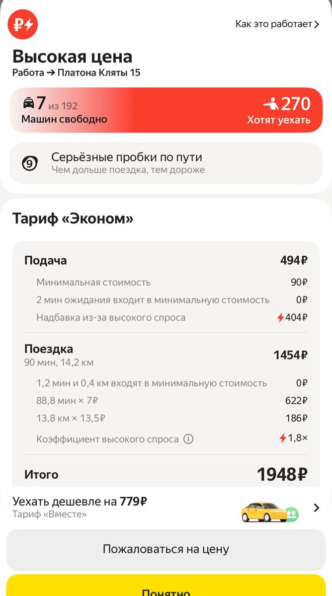 К 17:30 пробки в городе составляют 9 баллов. Заторы заставили службы такси повысить цены на услуги. В центре поездка стоит 600-900 рублей, на Сельмаш меньше, чем за 1000 не уехать, а на Суворовский дорога будет стоить около двух тысяч рублей 🤬 Агрегаторы показывают, что сотни людей хотят уехать по направлением, но, видимо, не решаются из-за цены. Сегодня ночуем на работе 💼 Но если вы уже застряли в пробке, почитайте новости @Donday
