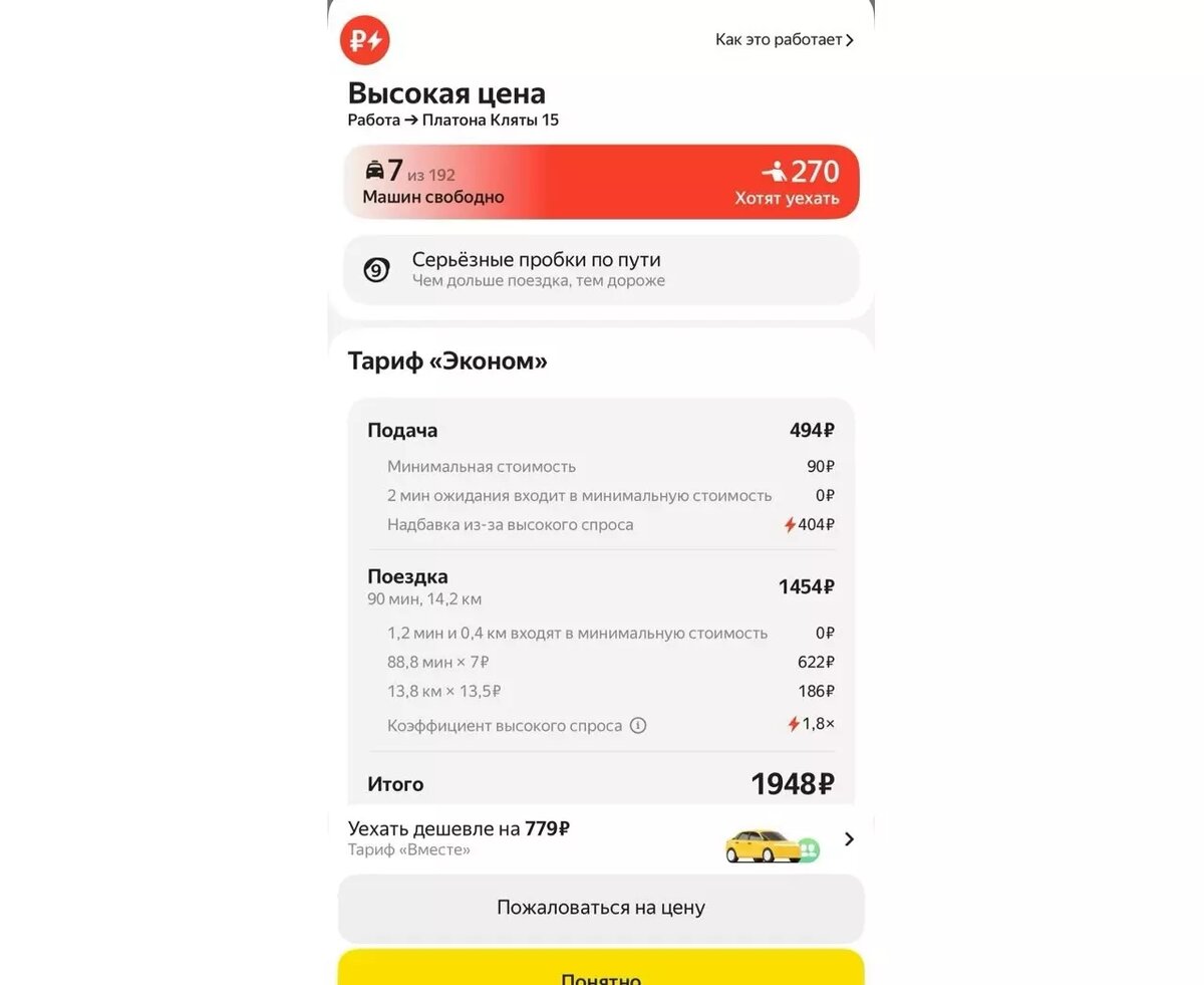 Из-за адских пробок цены на такси в Ростове-на-Дону взлетели до небес. Судя по данным сервиса «Яндекс.Карты», пробки в городе составляют 9 баллов. Чек за поездки увеличился примерно в два раза. При вызове машины всплывает сообщение: «Сейчас в этом районе много заказов, свободных машин не хватает. Система временно повышает цену, чтобы привлечь водителей из соседних районов». При этом повышенная стоимость не влияет на скорость подачи машины и на время в поездке. Ждать автомобиль приходится по 15-20 минут, а затем стоять в пробках, теряя драгоценное время. Некоторые пассажиры уже смирились с тем, что на такси иногда можно добираться еще дольше, чем на автобусе. И в десятки раз дороже. В центре поездка стоит 600-900 рублей, на Сельмаш - не меньше тысячи рублей, а в Суворовский - и вовсе две тысячи рублей. Пробки в городе образовались из-за непогоды. Сотни ростовчан в вечерний час пик вынуждены стоять в гигантских заторах.