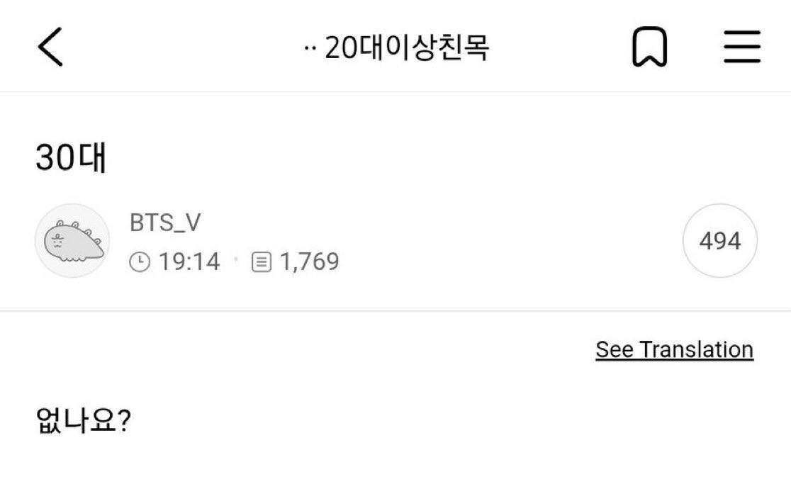 : Тэхён: А разве здесь нет никого, кому за 30? Арми: Что такое время? Хоть я и стала старше, мои чувства стали только глубже за последние 10 лет. Благодаря BTS я была счастлива и жила молодой, и я продолжу жить так и дальше. (Ей было 30 лет когда она познакомилась с BTS, а сейчас ей 40.) Тэхён: Нуна, вы всё ещё молоды. Тэхён: Давайте-ка по полной поиграем в игру воспоминаний? Арми: Тэхён-ним~ здесь Арми-тётушка, которой за 50 ^^ Тэхён: Тётушка~ здравствуйте! #V @kumihobts