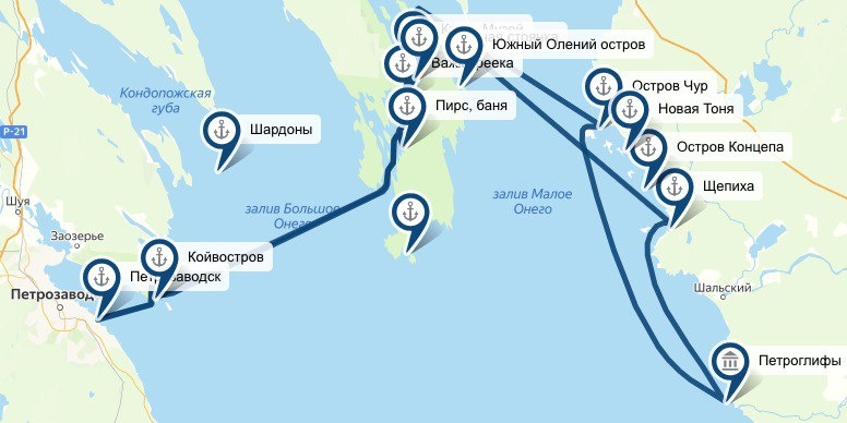 ! Продолжаем публикацию маршрутов по Онеге «Кижи и петроглифы» Обе мировые достопримечательности! Можно выбрать любое направление маршрута. Маршрут довольно легко может быть сокращен, в пользу паруса, пляжей, рыбалки или красот Унойского архипелага. День 1 Петрозаводск. После приема лодки выходим и встаем как можно дальше. Вплоть до в шхер. День 2 В шхерах встаем у Кижей. День 3 Кижи. Музей работает с 10 до 19-00. Короткое посещение и переход на Южный Олений остров. День 4 Остров Чур. Пляж, купания, рыбалка. День 5 Смотрим Петроглифы. У Бесова Носа на ночлег вставать опасно – грунт держит плохо, укрытий нет. Место ночевки у мыса Щепиха. День 6 Возвращаемся в шхеры. Пора в баньку! Бронируем заранее, по телефону, пока есть связь. День 7 В Петрозаводск. Из шхер до яхт клуба через Ивановский фарватер ходу примерно 6 часов.