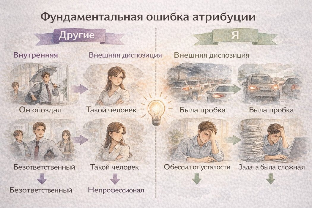а себе — внешние причины. Термин появился в социальной психологии благодаря работам Фрица Хайдера, Ли Росса и Гарольда Келли. В 1977 году Ли Росс ввёл выражение fundamental attribution error, показав, что люди систематически недооценивают влияние ситуации и переоценивают личностные факторы. То есть — мы почти всегда склонны думать, что человек «такой», а не что ему просто попалась сложная ситуация. Есть несколько причин. Объяснить всё личностью проще, чем разбираться в нюансах ситуации. Мы видим поведение — но не видим его