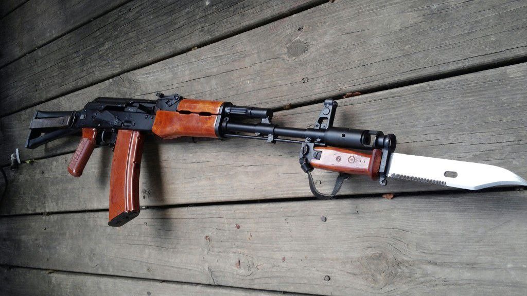 Данная модель является классическим образцом холодного оружия, предназначенного для комплектации автоматов Калашникова. Ниже приведены ключевые особенности, технические характеристики и сведения о маркировке изделия. Конструктивные особенности • Клинок: однолезвийный. Боевой конец выполнен двулезвийным, при этом со стороны обуха лезвие имеет вогнутую форму. • Обух: оснащен насечкой в виде пилы, что расширяет функциональные возможности ножа. • Рукоять: сформирована за счет полимерной накладки, которая надежно соединена с хвостовиком при помощи заклепки. • Крепление: • Упор оборудован кольцом со стороны лезвия клинка для фиксации на стволе. • В головке рукояти расположен Т-образный паз с подпружиненной защелкой. • Ножны: стальные по всей длине, имеют внешнее изолирующее покрытие из пластика. Конструкция включает специальный узел, позволяющий использовать штык-нож совместно с ножнами в качестве кусачек. • Подвес: подвесной ремень изготовлен из натуральной кожи. Технические характеристик