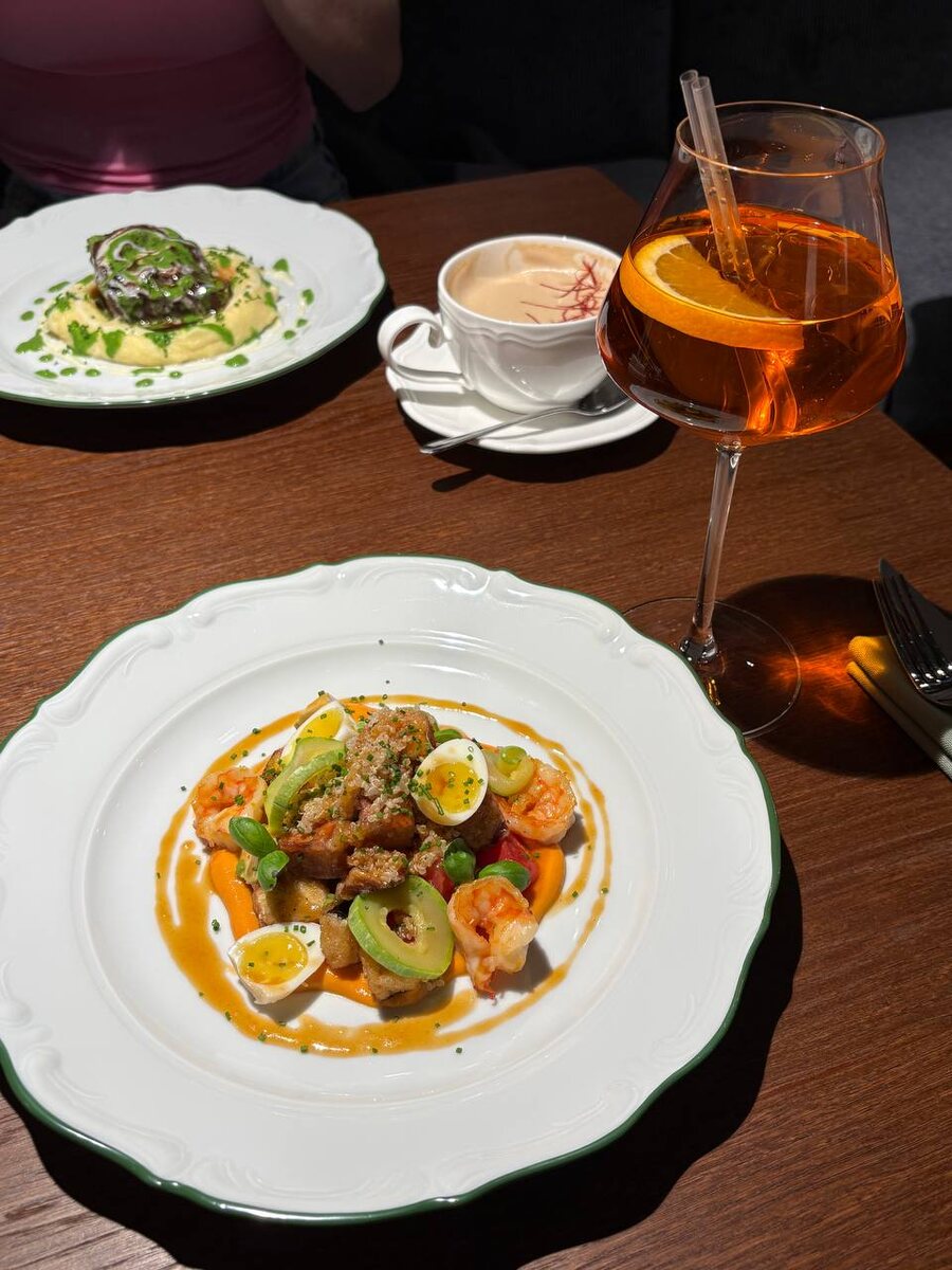 Кухня - разочарование. Заплатила больше трех тысяч и ушла голодная( Салат с креветками вкусный, подача симпатичная, но есть там особо нечего( я понимаю, что в ресторан люди ходят не обжираться, но порции совсем крошечные ) Паста с крабом..я даже не знаю как это комментировать…просто что-то безвкусное с непонятным химическим послевкусием. Доедать я не стала..( по фото в целом будет все понятно ) Это самое отвратительное, что я ела за последнее время. Пицца 4 сыра с грушей. Неплохо. Выглядит не совсем как обычная пицца. Она у них квадратная, разделена на 6 небольших кусочков. На 1-2 человека вполне достаточно. Восторга особо не было. У подруги была их фирменная щека. Я попробовала мясо( оно было мягким и достаточно вкусным) но щечки я пробовала во многих заведениях и тут я ничего особенного не увидела. Просто хорошо. Единственное, что прям порадовало так это персонал. Ребята молодцы! Видно, что стараются и пытаются уделить внимание каждому гостю. В целом в заведении приятно находитьс