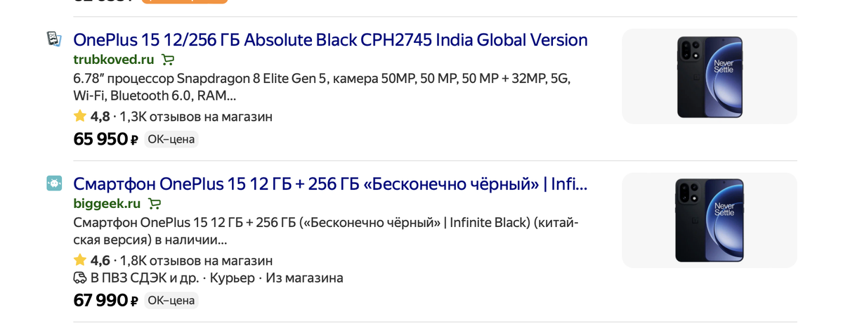 На первый взгляд OnePlus 15 и OnePlus 15R визуально выглядят почти одинаково. Отличается только компоновка модуля камеры: у одного три объектива, у другого - два. Однако, их цена различается почти в полтора раза. OnePlus 15R на момент написания публикации можно было купить по цене от 45.000 рублей в зависимости от площадки интернет-торговли. Цена флагмана OnePlus 15 в тот же момент начиналась от 66.000 рублей.