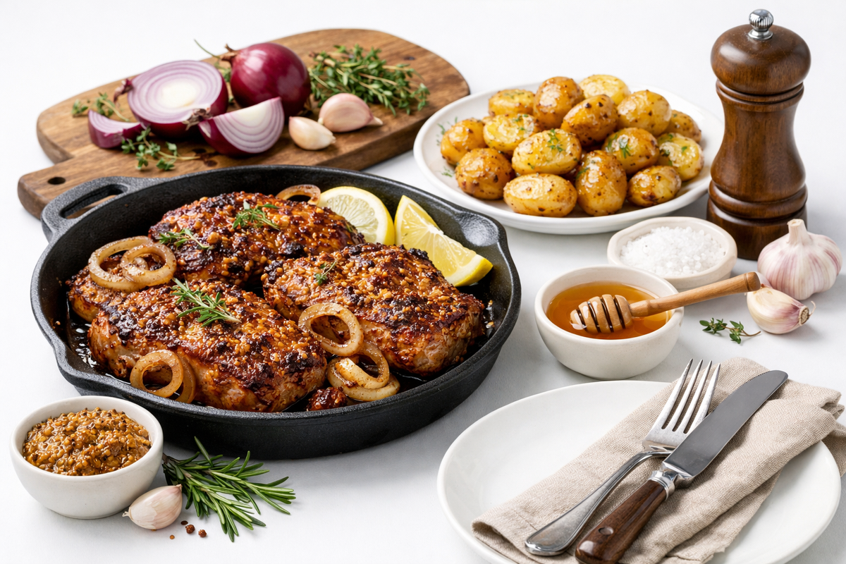 Я люблю такие рецепты за честность. Никаких сложных маринадов, лишних движений и долгой возни. Свиные стейки получаются румяными, сочными, с яркой сладко-острой корочкой и мягким луком, который пропитывается мясным соком. Это тот самый вариант, когда из простых продуктов выходит блюдо, выглядящее празднично и дорого.