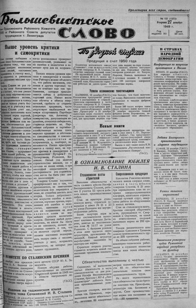 1949. Большевистское Слово, газета Пушкинского района г. Ленинграда. № 151 (1272), вторник 27 декабря. #ЦС