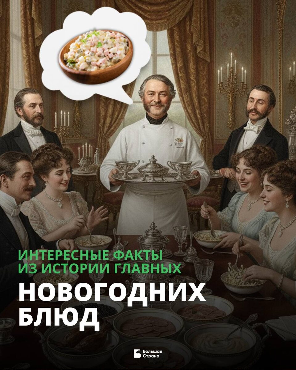 ? Сегодня мы решили вспомнить интересные факты из истории главных новогодних блюд. Оливье Салат, который стал символом праздника, он, который в начале XIX века держал московский ресторан «Эрмитаж». В оригинале ингредиенты выкладывались отдельно: рябчики, куропатки, паюсная икра, ломтики телячьего языка и соус «Провансаль». Гости, которым подали новый шедевр, не задумываясь всё перемешали, вместо того чтобы макать каждый кусочек в знаменитый соус. Люсьена это не обидело: в следующий раз он заранее нарезал все ингредиенты на мелкие кусочки и сразу залил майонезом. Холодец Первым холодец открыли кочевые народы Севера. В России это блюдо изначально считалось едой для прислуги: после пышных приёмов остатки мяса с барского стола заливали бульоном и выставляли на улицу. Со временем холодец дошёл до Франции, а русская интеллигенция, любившая всё французское, стала подавать его на праздничный стол богатых домов. Шампанское С начала времен Петра I шампанское переживало больше падений, чем вз