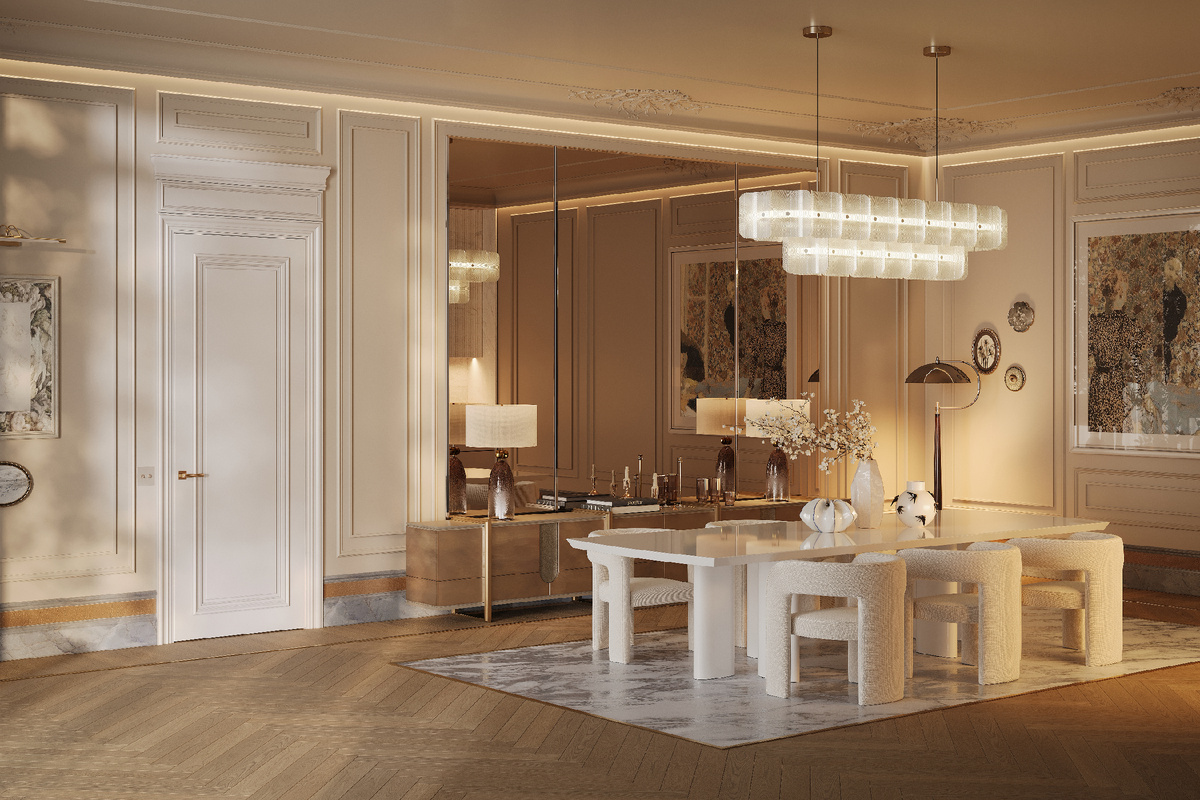 В новом интерьере с коллекцией Katalina мы разместили картину французского художника-символиста и импрессиониста Жана Эдуара Вюйара — «Интерьер за рабочим столом» (1893 год). Картина также известна под названиями «За столом» или «Жених». Жан Эдуар Вюйар любил раскрывать характеры людей через окружающие их интерьеры. Он считал, что детали обстановки (лампы, обои, мебель, часы и зеркала) способны передать психологические черты и социальные отношения в картине гораздо отчётливее, чем выражения лиц. Мы применили тот же художественный приём, который любил использовать Вюйар: родственную палитру. В нашей визуализации использованы оттенки от молочных до рыжевато-медных с одним комплиментарным пятном. Смежная палитра красок создаёт ощущение гармонии и близости, поскольку, как говорил сам художник, «тонко вмешиваясь друг в друга, они взаимодействуют». Вюйар в своей работе запечатлел мимолётное мгновение, когда мужчина заглянул в комнату к девушке. А вот момент встречи это или прощания — он оста