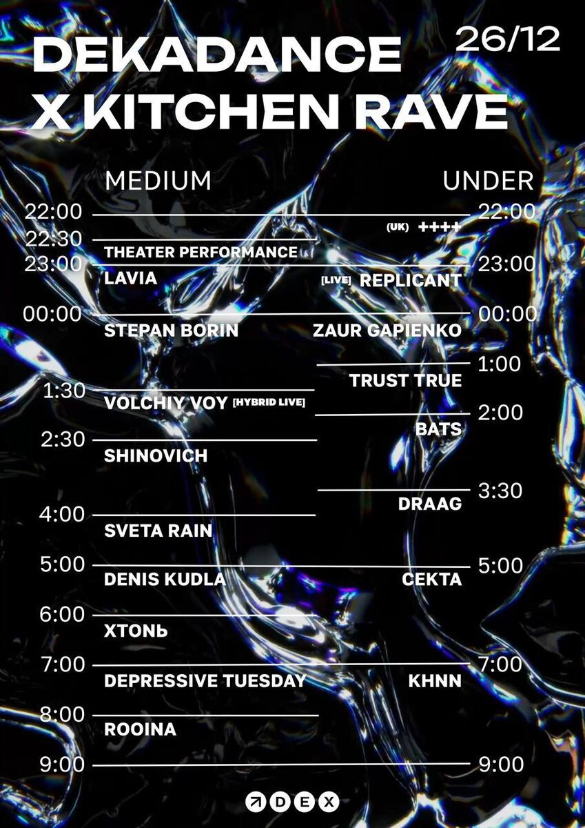 Две промо-команды объединяются, чтобы отпраздновать совместные дни рождения: 3 года Dekadance и первый день рождения Kitchen Rave. Состав артистов, определяющий звучание локальной андеграунд сцены с тяжелыми музыкальными акцентами. Артисты подобраны так, чтобы охватить разные уровни техно: от трайбла и гипнотика до жесткого харда, экспериментального техно и бескомпромиссного шранца. Подробности в этом посте. 🎫 Билеты FC/DC 18+ 📆 26 декабря, с 22:30 📍DEX, Москва , Шарико- подшипниковская ул., 13, стр. 32э