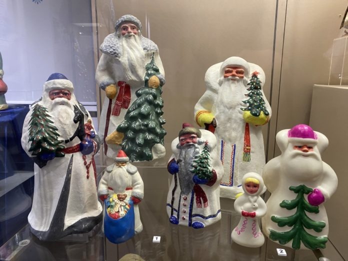 Экспозиция не ограничивается музейными фондами. Особый шарм ей придают частная коллекция Дедов Морозов и Снегурочек от Владимира Мильцина и сказочные игрушки художницы Елены Бабкиной, добавляющие всей выставке нотку авторского волшебства.