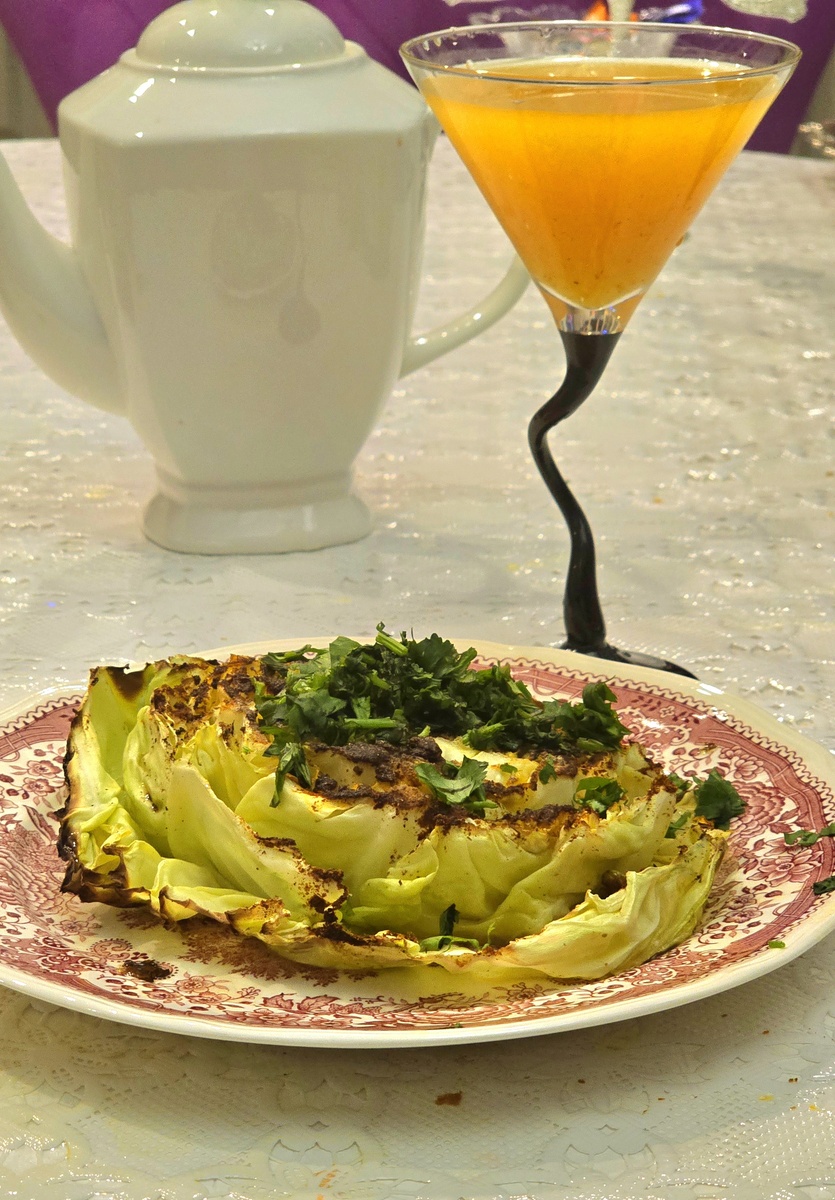 Пряный, ароматный , сочный стейк из молодой капусты. Праздничное блюдо для вегетарианцев и соблюдающих Рождественский пост. Прекрасная узбекская молодая капуста сейчас во Вкусвилл . Делюсь рецептом красивых стейков из нее , напоминающих красивый цветок розы. молодая капуста —1 кочан. Копченая паприка или прованские травы 1 чайная ложка, тертый чеснок 3 зубчика. оливковое масло (для тех, кто не постится сливочное) — по столовой ложке на стейк. чеснок — 1–2 зубчика; соль, чёрный перец — по вкусу. Свежая кинза для подачи Приготовление: Молодую капусту режем на круглые стейки как на фото, толщиной 5 см. Рафинированное оливковое масло (например Монини или Борхез) смешиваем с прованскими травами или копченой паприкой и с тертым чесноком. Если не поститесь, то можно взять сливочное масло, а не оливковое , будет сливочный вкус. Выкладываем стейки в форму для запекания, слегка смазанную маслом , солим, перчим по вкусу. Сверху смазываем соусом из масла и прованских трав (или копчено
