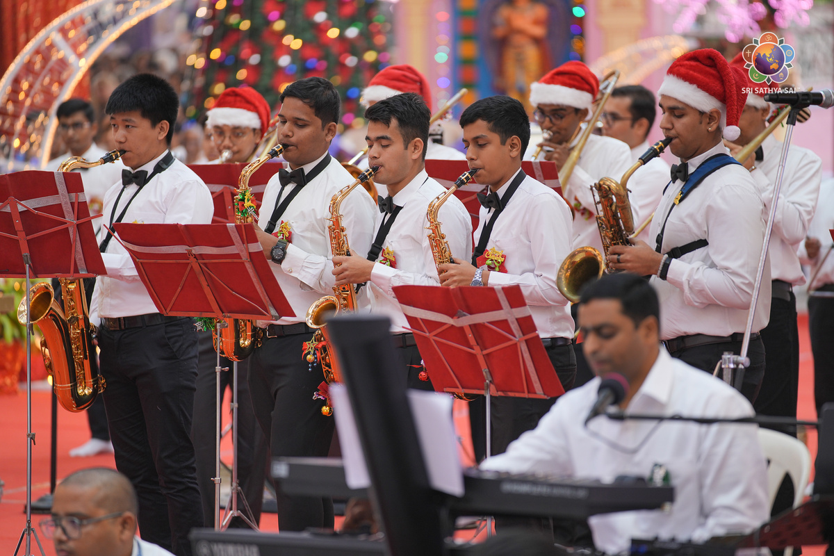 Празднование развернулось благодаря душевным выступлениям учеников Свами. Успокаивающие скрипичные мелодии учеников начальной школы, яркие рождественские гимны в исполнении университетского духового оркестра и мелодичные выступления группы «Прашанти Бхаджан» создали атмосферу радости и преданности. Голоса, изящно чередующиеся в сопрано, альте и басе, передавали вневременное послание любви, единства и веры, радостно прославляя рождение Царя царей и Господа господ.