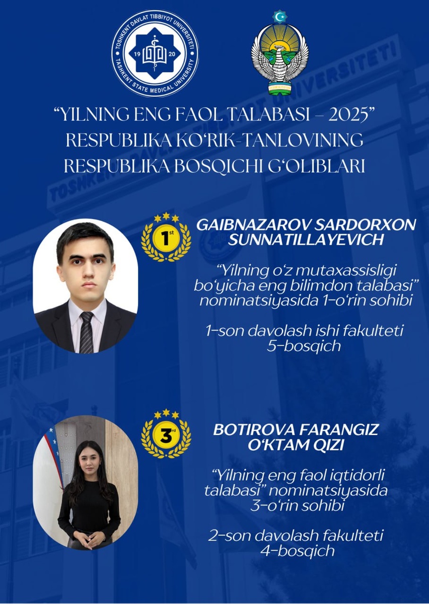 yuksak natijalarga erishib, universitet sha’nini munosib himoya qildilar. 🎓 Gaibnazarov Sardorxon Sunnatillayevich — Toshkent davlat tibbiyot universiteti 1-son davolash ishi fakulteti, 5-bosqich talabasi “Yilning o‘z mutaxassisligi bo‘yicha eng bilimdon talabasi” nominatsiyasida 🥇 1-o‘rin sohibi bo‘ldi. Sardorxon Gaibnazarov o‘zining chuqur nazariy bilimlari, amaliy tayyorgarligi, ilmiy izlanishlarga bo‘lgan intilishi hamda o‘quv jarayonidagi faolligi bilan hakamlar hay’ati tomonidan yuqori baholandi. Ushbu yutuq uning tibbiyot sohasidagi puxta tayyorgarligi va kelajakda malakali mutaxassis bo‘lish yo‘lidagi qat’iy intilishining yorqin dalilidir. 🎓 Botirova Farangiz O‘ktam qizi — Toshkent davlat tibbiyot universiteti 2-son davolash fakulteti, 4-bosqich talabasi “Yilning eng faol iqtidorli talabasi” nominatsiyasida 🥉 3-o‘rin sohibasi bo‘ldi. Farangiz Botirova o‘zining ijodkorligi, ijtimoiy faolligi, ta’lim va jamoat ishlaridagi tashabbuskorligi hamda iqtidorini namoyon etib, re