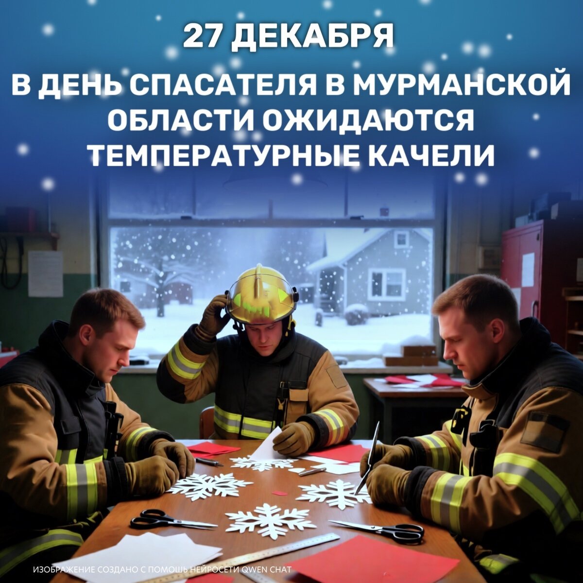 🌨 В Кольском Заполярье 27 декабря, в День спасателя и День бумажных снежинок, прогнозируют облачную, ночью с прояснениями погоду