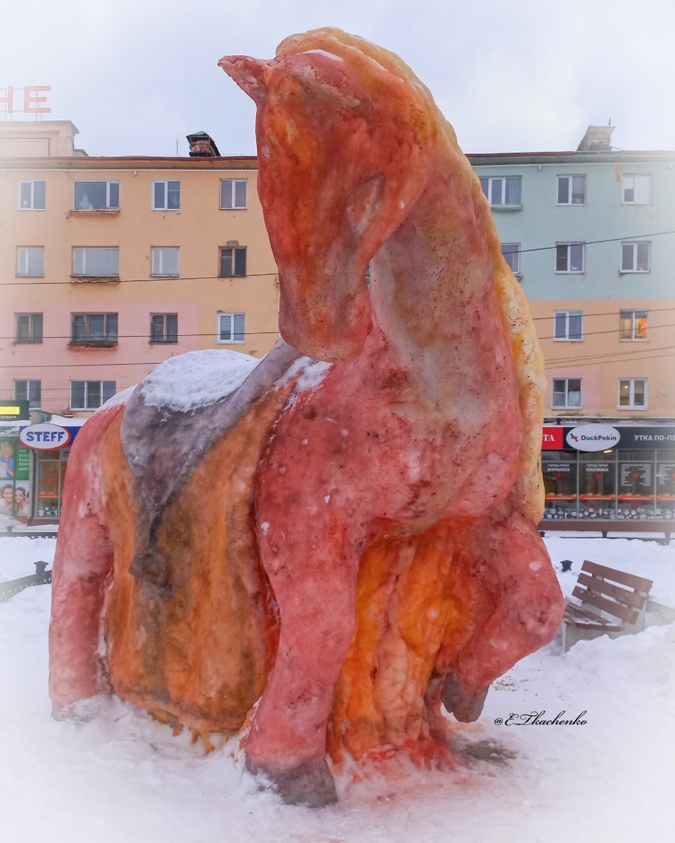 Символ года в Мончегорске не выдержал тёплой погоды и немного поплыл 🫠