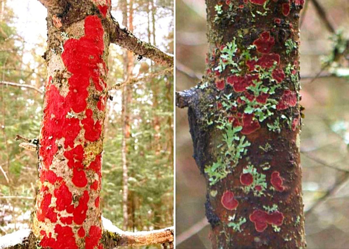 ». В национальном парке «Таганай», расположенном в Челябинской области, наблюдается необычное природное явление: кора многих деревьев приобрела насыщенный тёмно-красный оттенок. Специалисты парка объясняют эту аномалию активностью гриба, который использует в пищу отмершую древесину. Речь идет о виде, известном в науке как гименохета пурпурная (или гименохета окровавленная), а в просторечии - пурпурная вешенка. Этот организм, питающийся мёртвой органикой, преимущественно захватывает лежащий на земле валежник и сухие стволы. Однако он также способен паразитировать на живых, но ослабленных болезнями деревьях. Плодовые тела гриба отличаются округлой формой и винно-красным цветом; они плотно прирастают к поверхности древесины, часто образуя сросшиеся группы. В фазе спороношения их окраска может становиться синеватой. Патоген представляет особую опасность, когда поражает живые растения, проникая через повреждения коры на ветвях, стволе или корнях. Его распространению активно способствует