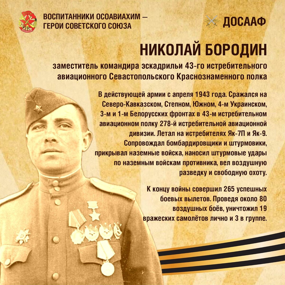 Николай Васильевич Бородин (1919–1946) — заместитель командира эскадрильи 43-го истребительного авиационного полка, старший лейтенант, один из прославленных асов Великой Отечественной войны. Родился в Забайкалье, прошёл путь от рабочего золотодобывающего рудника и электросварщика до военного лётчика. Окончил Шилкинский авиаклуб ОСОВИАХИМ в 1938г. и военные авиационные школы, с 1943 года — в действующей армии. Сражался на Северо-Кавказском, Южном, Украинских и Белорусских фронтах. Участвовал в легендарных воздушных боях на Кубани, в освобождении Донбасса, Крыма, Белоруссии, Литвы, Польши и в Берлинской операции. Летал на истребителях Як-7 и Як-9, сопровождал бомбардировщики, прикрывал войска, вёл воздушную разведку и штурмовые удары. За годы войны: • совершил 265 боевых вылетов • участвовал в около 80 воздушных боях • лично сбил 19 самолётов противника, ещё 3 — в группе За мужество и героизм Указом Президиума Верховного Совета СССР 23 февраля 1945 года Николаю Васильевичу Бородину