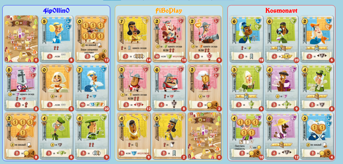 Продолжаю свой отчет с Арсением, Сашей из Немного о настолках и Машей с канала FiboPlay. Следующей игрой стал Замок де Комбо. В игре все просто: вы покупаете за деньги карты на рынке в одной из двух стопок. Эти карты вы выкладываете в своей личной зоне, но так, чтобы получилась зона 3 на 3 карты. Каждая карта дает мгновенный эффект, а также ПО в конце игры по определенным условиям. Важно расположить их так, чтобы выжать из них как можно больше победных очков. Первая партия была провальной, так как у Маши в один прекрасный момент отказалась работать платформа. В итоге мы закончили партию. Но следующая партия прошла успешно. Маша коллекционировала ключи, Саша все делал идеально, а мы с Арсением...ну мы что-то просто делали. Тотальный разгром можно видеть на фотографии с финальным счетом. Саша набрал 97 ПО, планку в 100, к сожалению, не перебил. Не ожидал, что Маша наберет 92, но там только за ключи 27 ПО, так что неудивительно) Ну и мы с Арсением "чуть-чуть" отстали))) Классная игрушка!