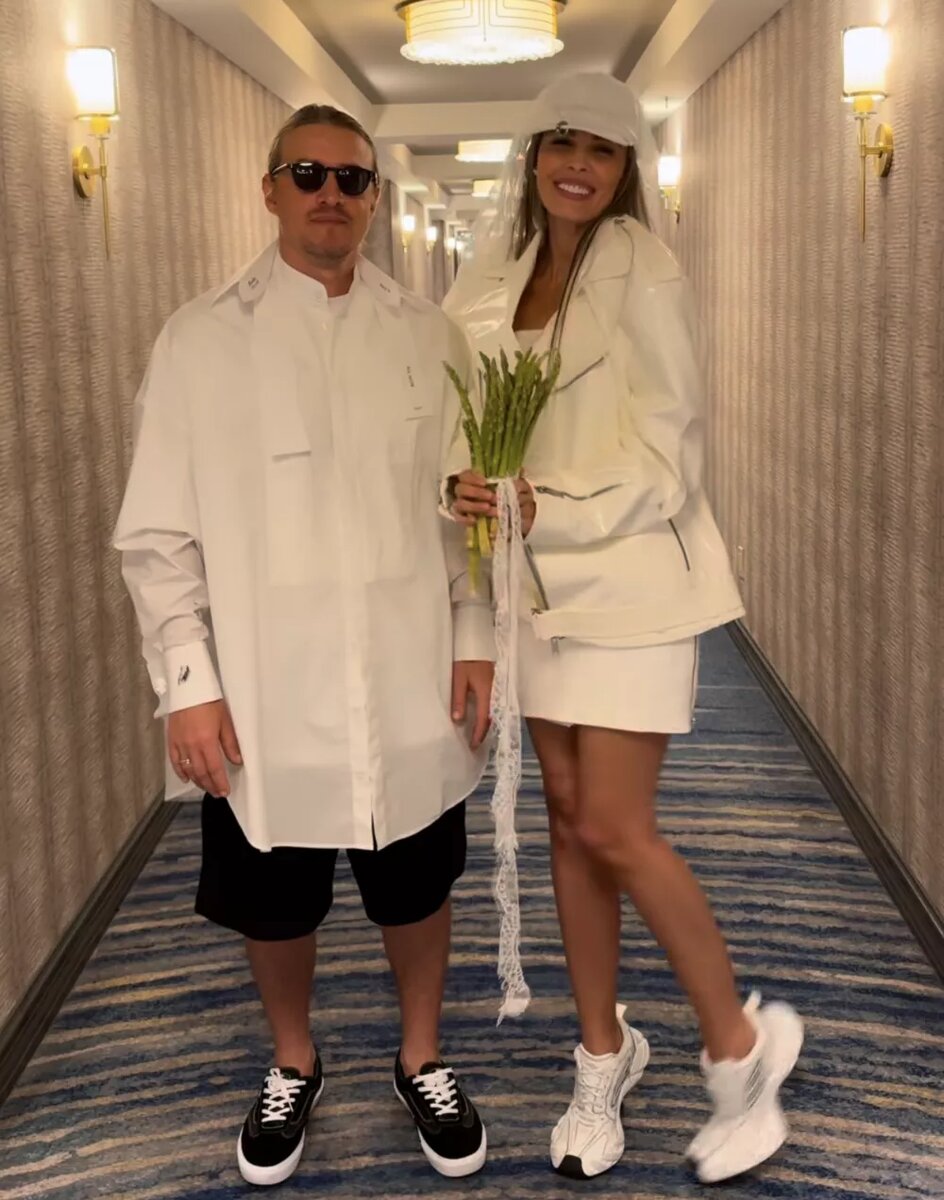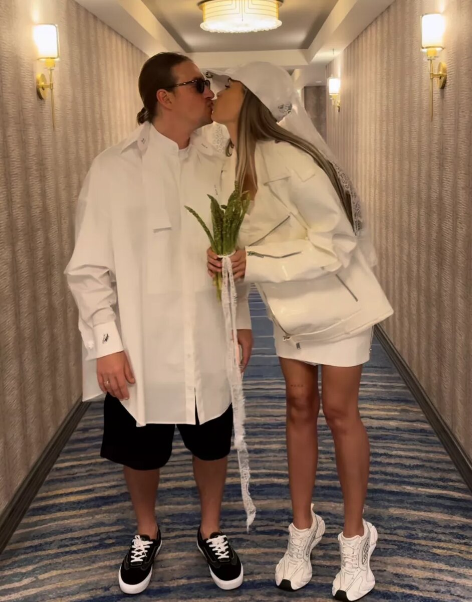 Звезда "Кухни" и ее супруг Кирилл обновили клятвы в стиле рок‑н‑ролл. Известная актриса Мария Горбань, запомнившаяся зрителям как экранная супруга Дмитрия Нагиева в сериале “Кухня”, устроила незабываемое свадебное приключение со своим реальным мужем — кинооператором Кириллом Зоткиным. Пара отправилась в США, где в атмосфере неоновых огней Лас-Вегаса решилась на символический обряд бракосочетания. Для церемонии Мария выбрала смелый ансамбль: лаконичное белое мини-платье с открытыми плечами стало основой образа, а его дерзкое звучание усилила объемная куртка из латекса. Невеста отказалась от традиционных туфель, предпочтя белые кроссовки с контрастной черной шпилькой. Оригинальности добавили ажурная фата в сочетании с бейсболкой — неожиданный дуэт, ломающий стереотипы. Но главным сюрпризом стал букет: вместо цветов Горбань держала в руках пышную связку зеленой спаржи, подчеркнув креативный подход к торжеству. Кирилл Зоткин поддержал экспериментальный настрой: его наряд состоял из свободн