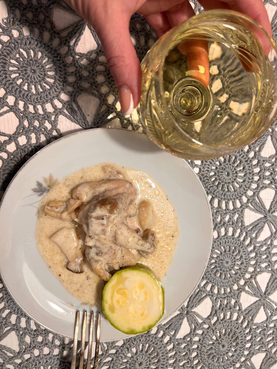 Курица (или кура, кому что) в сливочном соусе с белыми грибами и кабачок на гриле. Запивать белым шардоне 🤍