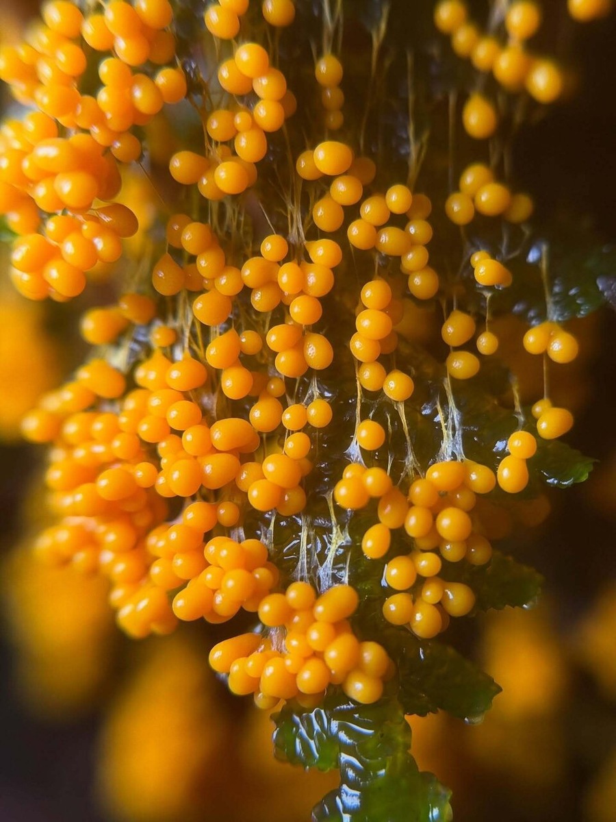 Миксомицеты лат Myxomycetes класс настоящих слизевиков Этот вид имеет желтооранжевыеплазмодийные структуры которые ползают по всей поверхности поглощая пищу пока не заберутся на какуюнибудь поверхность и не начнут образовывать свисающие нити с каплевидными образованиями похожими на яйца которые являются спороносными спорангиями По мере созревания они меняют цвет с...