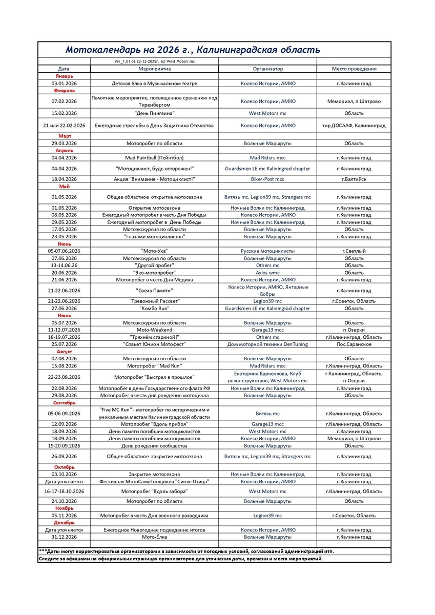 ! Вышла в свет первая версия мотокалендаря Калининградской области на сезон 2026. По вопросам внесения изменений - пишите в личку https://vk.com/id994599 или в сообщения этой группы. С нетерпением ждем нового сезона!
