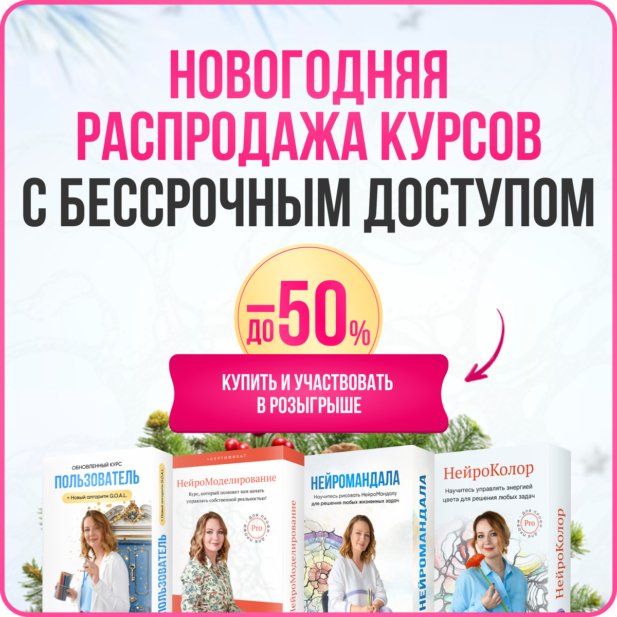 🔸Участие в розыгрыше 100 000 р. Рекомендую воспользоваться лучшими условиями сейчас, а обучение начать — в удобное для вас время! Выбрать курс по лучшей стоимости 👈 ✅ Курс Пользователь — необходимая ступень для правильного и эффективного освоения Нейрографики = ключ к вашим мечтам, целям и желаниям! После его прохождения вы сможете прорисовывать и снимать блоки и ограничения в абсолютно любых темах — от отношений и самореализации до финансов и здоровья. А полученные знания помогут осознать глубину метода и получать результаты проще и быстрее! В курс включены все обновления 2025 года + новый коучинговый алгоритм G.O.A.L. Хочу Пользователь 👈 ✅ Курс НейроМоделирование Это курс, который поможет вам начать управлять собственной реальностью! Пройдя этот курс, Вы: ✔️Узнаете о за