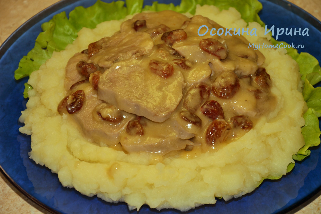 Языки готовлю нечасто - всё-таки жирненькие, но зимой на Урале иначе не выжить) В кастрюлю с кипящей подсоленной водой положила 2 свиных языка, по нескольку горошин душистого и чёрного перцев и варила около 2 часов до готовности, языки переложила в миску и охладила под холодной проточной водой, затем очистила от кожицы и порезала на ломтики поперёк. В сотейнике на 1 ст.л. топлёного сливочного масла обжарила 1 ст.л. муки, добавила 1 стакан процеженного бульона от варки языков, добавила горсть мягкого крупного изюма, довела всё до кипения, добавила 2 ст.л. столового хрена, промешала, через минуту-другую добавила языки, промешала, чтобы соус обволок все ломтики языка, прогрела ещё пару минут и подала с картофельным пюре. Просто, быстро и бесподобно вкусно) Приятного аппетита